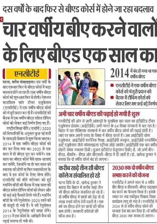 एक साल का बीएड कोर्स वे छात्र कर पाएंगे, जिन्होंने या तो चार साल की ग्रैजुएशन की होगी या फिर पोस्ट ग्रैजुएशन के बाद वे इस कोर्स के लिए एलिजिबिल होंगे। नैशनल काउंसिल फॉर टीचर एजुकेशन (एनसीटीई) की बीते शनिवार को हुई गवर्निंग बॉडी की बैठक में एक साल की बीएड समेत टीचिंग कोर्स को लेकर और भी कई बड़े फैसले लिए गए हैं।